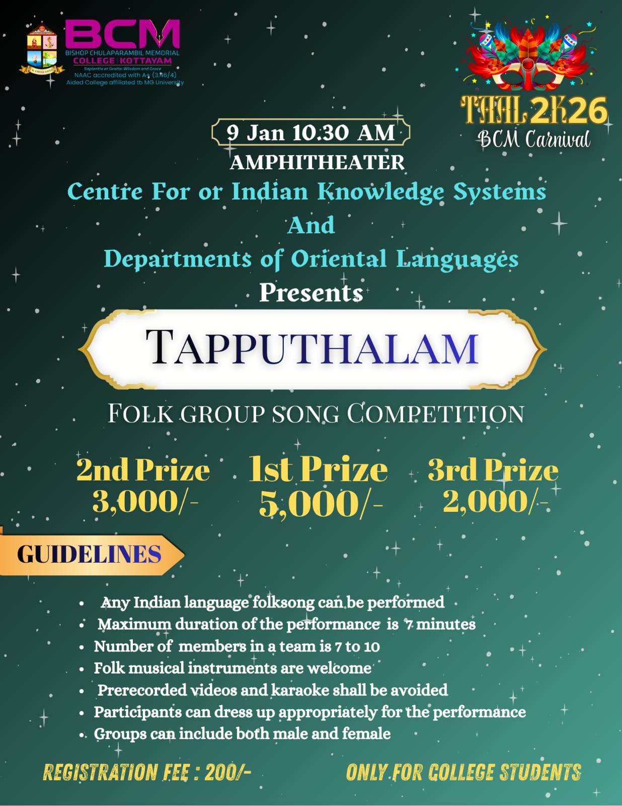 Tapputhalam is a folk group song competition presented as part of TAAL 2K26 – BCM Carnival. The event celebrates the rhythmic and cultural richness of Indian folk music, encouraging group performances that highlight tradition, harmony, and collective expression. Participants are invited to showcase authentic folk styles using live musical instruments and traditional presentation.